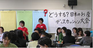 ◆ シンポジウム◆ 「今、どこで、何が、問題なのか」 神奈川県立汐見台病院 産婦人科医師 早乙女 智子さん 「どうする?日本のお産ディスカッション大会」の実行委員として全国各地を巡ってこられた早乙女さん。日本の産科医療の現状と問題についてお話して下さいました。助産師と産科医師の連携システムなど各地の取り組みの紹介もあり、これからの周産期医療システムについて示唆をいただきました。![]() 「高知の出産施設と産科医の現状」 高知大学医学部附属病院 産婦人科医師 林 和俊さん 高知県の産科医療について、高知県の地理的事情や産科施設、産科医師の現状もふまえてお話して下さいました。高知県の年間出生数の半数以上(約4000件)は高知市周辺に集中しており、もうすでにお産の集約化は進んでいること。また高知県でも産婦人科医師や助産師数はこれから減少していくと考えられるため、よりいっそう産科に関わるスタッフの協調姿勢が必要であること、お産のリスクを見直し、施設の機能分担が必要であることなどが示唆されました。 「産院不足の地域で助産院が果たす役割について」 愛媛県四国中央市 マミー助産院 助産師 佐々木 真理さん(代理 今村 朋子さん) 平成17年12月にマミー助産院を開院。4ヵ所から1ヵ所に出産施設が激減した四国中央市のお産事情も含めて、開業までの経緯と地域の中での助産院の役割についてお話して下さいました。助産院の特長を生かして自分たちが地域で果たせる役割を日々模索しながら、嘱託医や連携医療機関、地域の保健センターや行政とのつながりを大切にして活動されているとのことでした。 ![]() 「ママが安心して幸せな気分で赤ちゃんをだっこできるサークルにしたい」 徳島県海部郡海陽町 妊婦サークルプレママクラブ代表 母親 中島 育代さん 平成17年6月、第3子妊娠中に妊婦サークルを結成。県立海部病院の産婦人科医不足の現状も含めて、これまでのサークル活動経過をお話して下さいました。とてもユニークな活動が紹介され、妊婦さん同士の活動の中で女性自身が自分で産むんだ!という心と身体づくりを目指していること、そして産婦人科医や助産師が住みたいと思える地域づくりを目指して活動していることが話されました。 ◆ グループディスカッション◆ 午後からは、4〜5名のグループに分かれて、次の5つの小テーマについて「誰が・・・何する・・・」という具体的な対策を自由な発想で話し合いました。説得力のある意見から、現実的でないアイディアまで、様々な意見が飛び出しました!このような形式で、難しい議論ではなく、思いついたままにアイディアを出し合うディスカッションにしたことで、お産問題の解決は専門家のみにゆだねられているのではなく、だれもがこの問題に向けて行動できる当事者である、という思いを皆さんが持ったのではないかと思います。グループワークの後は、グループごとの意見を記したポストイットを模造紙に貼って全体発表を行い、意見を共有しました。その意見の一部を紹介します。 (1) 増やす:お産の専門家〜産科医、助産師、小児科医〜のなり手を増やすには? ![]() 「国や都道府県が助産学校を増やす・金銭的にも補助する・専門学校を失くさない」など、助産師の養成機関そのものの充実を求めえる声が多く出されました。「産科医・助産師が学校の先生に自分たちの仕事の素晴らしさをきちんと伝える」というように、なり手を増やすために、現在、働いている人が職業をアピールすることも必要だという意見がでました。 ファシリテーターの熊手さんと実行委員長の |